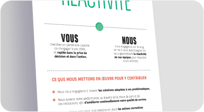 Business is ON ENGAGEMENT N°3 RÉACTIVITÉ VOUS NOUS cherchez un partenaire capable nous engageons sur le long de s’engager à vos côtés, terme à vous accompagner en et rapide dans la prise de vous garantissant la réactivité décision et dans l’action. de nos équipes pour répondre à vos attentes. CE QUE NOUS METTONS EN ŒUVRE POUR Y CONTRIBUER Nous nous engageons à trouver les solutions adaptées à vos problématiques. Nous suivons notre performance, au travers de la revue de parc et de ses indicateurs, afin d’améliorer continuellement notre qualité de service. Nous validons avec vous, puis mettons en place les actions correctives pour l’utilisation optimale de vos matériels. Nous mesurons régulièrement la satisfaction de nos clients, puis nous définissons des plans d’action pour l’améliorer.