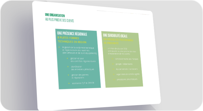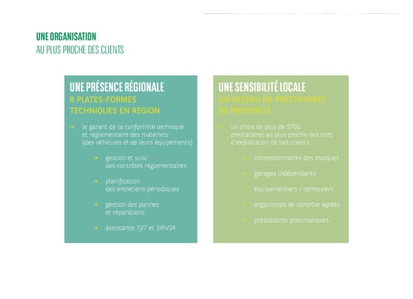 UNE ORGANISATION AU PLUS PROCHE DES CLIENTS UNE PRÉSENCE RÉGIONALE UNE SENSIBILITÉ LOCALE 8 PLATES-FORMES UN RÉSEAU DE PRESTATAIRES TECHNIQUES EN REGION DE PROXIMITÉ k le garant de la conformité technique k un choix de plus de 3700 et réglementaire des matériels prestataires au plus proche des sites (des véhicules et de leurs équipements) d’exploitation de nos clients : k gestion et suivi k concessionnaires des marques des contrôles réglementaires k garages indépendants k SODQLǞFDWLRQ des entretiens périodiques k équipementiers / carrossiers k gestion des pannes k organismes de contrôle agréés et réparations k prestataires pneumatiques… k assistance 7j/7 et 24h/24