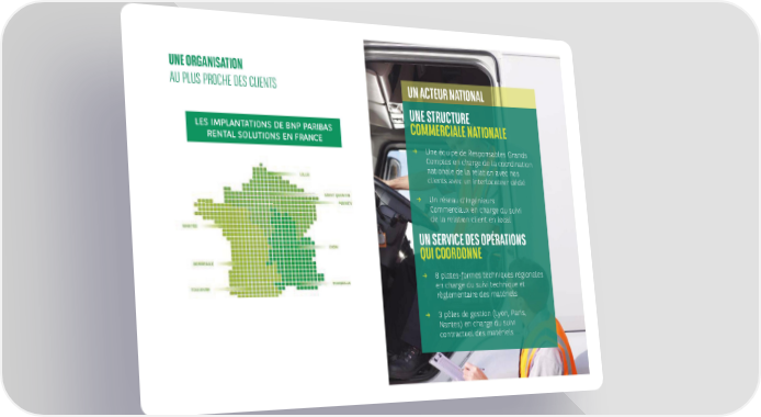 UNE ORGANISATION AU PLUS PROCHE DES CLIENTS UN ACTEUR NATIONAL UNE STRUCTURE LES IMPLANTATIONS DE BNP PARIBAS COMMERCIALE NATIONALE RENTAL SOLUTIONS EN FRANCE k Une équipe de Responsables Grands Comptes en charge de la coordination nationale de la relation avec nos clients avec un interlocuteur dédié k Un réseau d’Ingénieurs Commerciaux en charge du suivi de la relation client en local UN SERVICE DES OPÉRATIONS QUI COORDONNE k 8 plates-formes techniques régionales en charge du suivi technique et règlementaire des matériels k 3 pôles de gestion (Lyon, Paris, Nantes) en charge du suivi contractuel des matériels UNE ORGANISATION